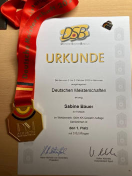Sabine Bauer schaffte bei der Disziplin Kleinkaliber 100 Meter den 1. Platz und ist somit in dieser Disziplin Deutsche Meisterin!